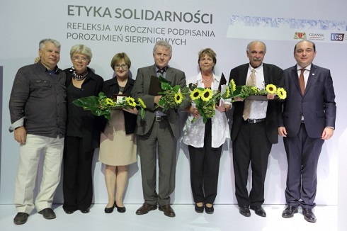 v.l.n.r.: Bogdan Borusewicz, Vorsitzender des Senats im polnischen Parlament, Mitglied im Kapitel für Dankbarkeitsmedaille, Mitorganisator des Danziger Streiks 1980, Danuta Winiarska-Kuroń, Mitglied im Kapitel für Dankbarkeitsmedaille, Waleria Radziejowska-Hahn, Gerd Koenen, Preisträger 2015, Christina Russmann, Preisträgerin 2015, Prof. Michel Wieviorka, Preisträger 2015, Basil Kerski, Leiter des Europäischen Solidarność-Zentrums in Danzig