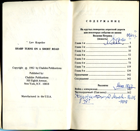 von Lew Kopelew im Inhaltsverzeichnis mit Jahreszahlen und Orten, an denen die Texte entstanden sind.